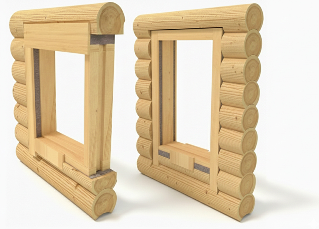 По основе конструкции и принципу работы оба варианта одинаковые. Отличаются способом развязывания с дверными и оконными проемами. По бокам «обсады» крепится брусок, конструкция вместе с ним вставляется в предварительно выпиленные штробы в торцах проема. Для «колоды» наоборот — на торцах делается шип, а в боковинах выбирается ответный паз.