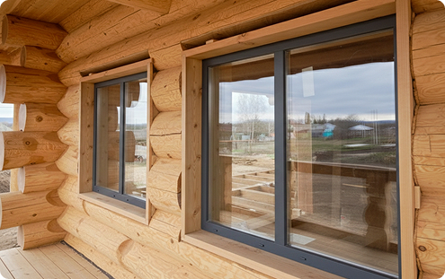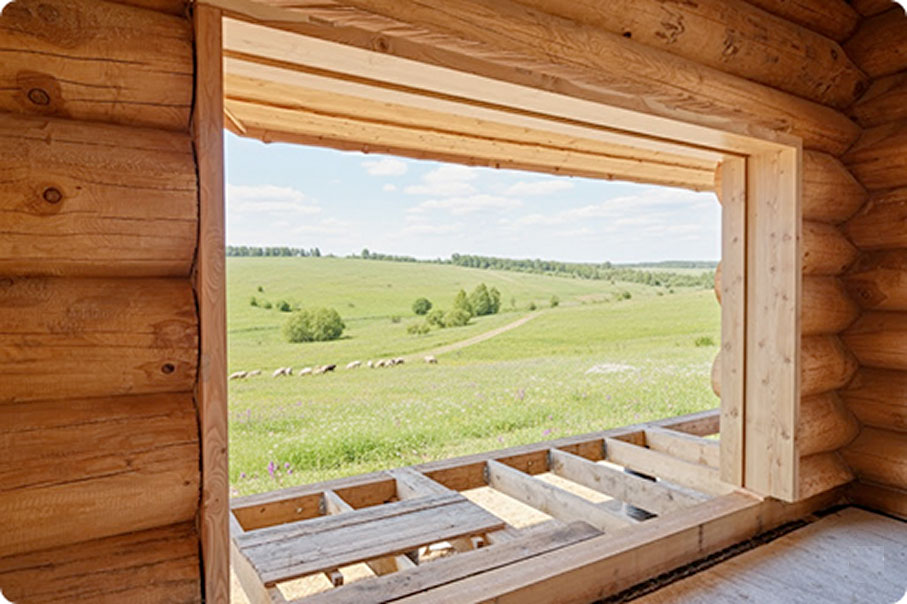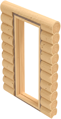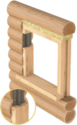 С предварительным подравниванием проемов сруба и выпиливанием затёсов «лысок» по периметру проема для последующего монтажа наличников. Вместе с обсадными коробками можно заказать подоконники толщиной 70-100 мм и наличники любого дизайна.