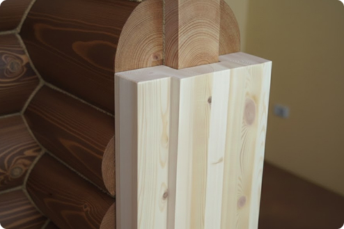 В нашей компании затёсы под наличники выполняются еще на стадии изготовления сруба, так проще и выгодней, в отличие от изготовления по месту. Лыски впоследствии достаточно будет немного подровнять и отшлифовать. Штробы по бокам проемов под закладной брусок обсадной коробки можно сделать на Производстве тоже.
